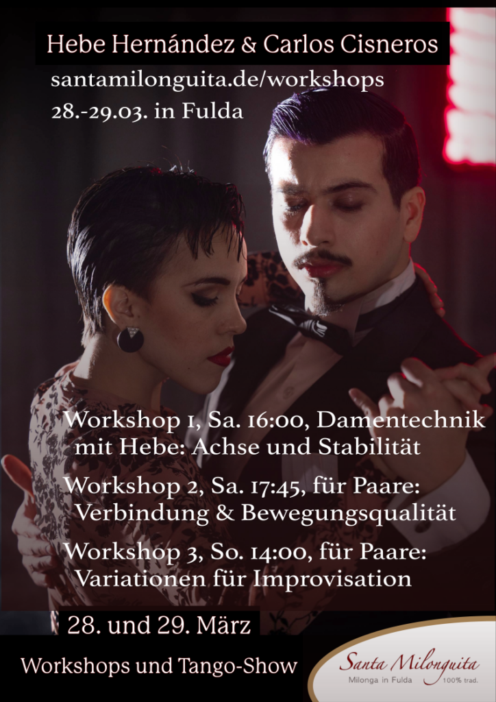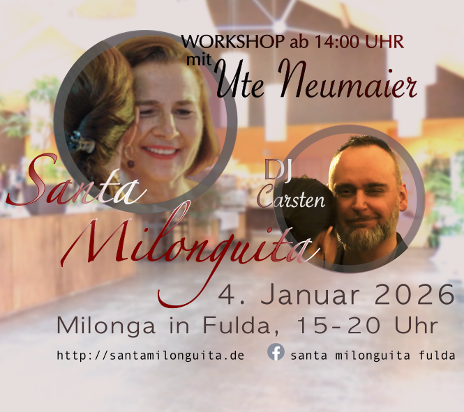 - Ute Neumaier in Fulda, 2.-4. JanuarWir konnten Ute Neumaier aus Buenos Aires für ein Workshop-Wochenende im Januar gewinnen. Es wird am 2.-4. Januar stattfinden, mit einer Milonga Solidaria als Abschluss… Ute Neumaier in Fulda, 2.-4. Januar weiterlesen